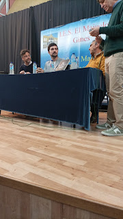 El pasado 30 de marzo tuvo lugar, en el salón de actos del IES El Majuelo, una mesa redonda en torno a la novela La deuda, del exalumno Álvaro Ruiz Martínez, quien se graduó en nuestro instituto con unas calificaciones magníficas, como prueba nuestro árbol de la excelencia. Participaron los tres cursos de 2º de Bachillerato y la charla fue presentada por el director del centro, don Miguel Cerro. Durante más de media hora, los profesores de Lengua y Literatura don Coradino de la Vega y don Faustino Díaz fueron intercambiando impresiones con el autor sobre el proceso de escritura de la novela y su vocación literaria. A continuación, fue el propio alumnado quien comenzó a preguntar a Álvaro Ruiz cuestiones relacionadas con el tema, estableciéndose un interesante coloquio. Al acto asistieron además el actual jefe de estudios y antiguo profesor del autor, don José Luis Navarro, así como familiares y otros exprofesores de Álvaro Ruiz Martínez. Al finalizar el encuentro, se obsequió al escritor con un detalle del IES El Majuelo.